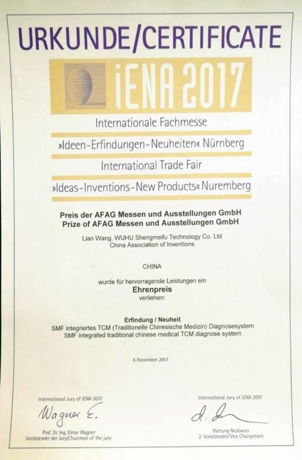 此次獲獎(jiǎng)是公司繼榮獲科技部創(chuàng)新基金、國家高新技術(shù)企業(yè)、中醫(yī)診斷行業(yè)標(biāo)準(zhǔn)制定方、驗(yàn)證方、首批入選“治未病服務(wù)適宜設(shè)備”、CE認(rèn)證等多項(xiàng)榮譽(yù)之后取得的國際性發(fā)明大獎(jiǎng),是我公司科研實(shí)力、綜合實(shí)力不斷提升的重要標(biāo)志。